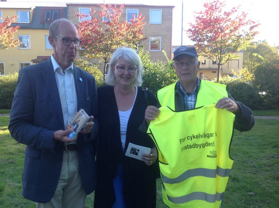 Efter Helsjön tog jag mig till Fristad där Framtid i Fristad hade arrangerat ett politiskt torg och en debatt med kommunpolitiker om Fristads framtid. Annette företrädde oss på ett bra sätt i en i övrigt relativt slätstruken debatt. En bil på en ”cykelbanelobbyist”, Annette och mig (med fånig min) får avsluta torsdagens valrörelserapport.