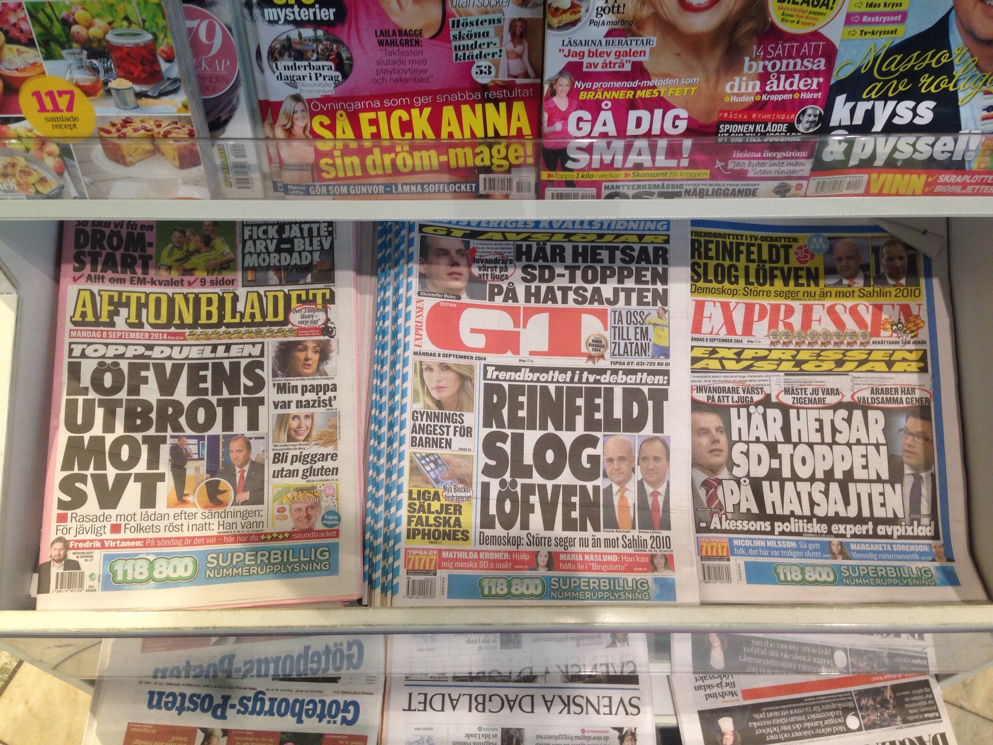 Två tidningar ropar ut att Reinfeldt vann och en tidning visar att Löfven har dåligt humör. Sammantaget både motgång och brist på glädje. På samma gång som (S):s stämningsläge sänks så stiger vårt (och mitt).